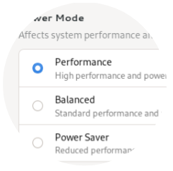 Use performance mode to boost hardware speed when you need it. Turn off notifications with Do Not Disturb. Press the Super key and just type to search for what you need.
